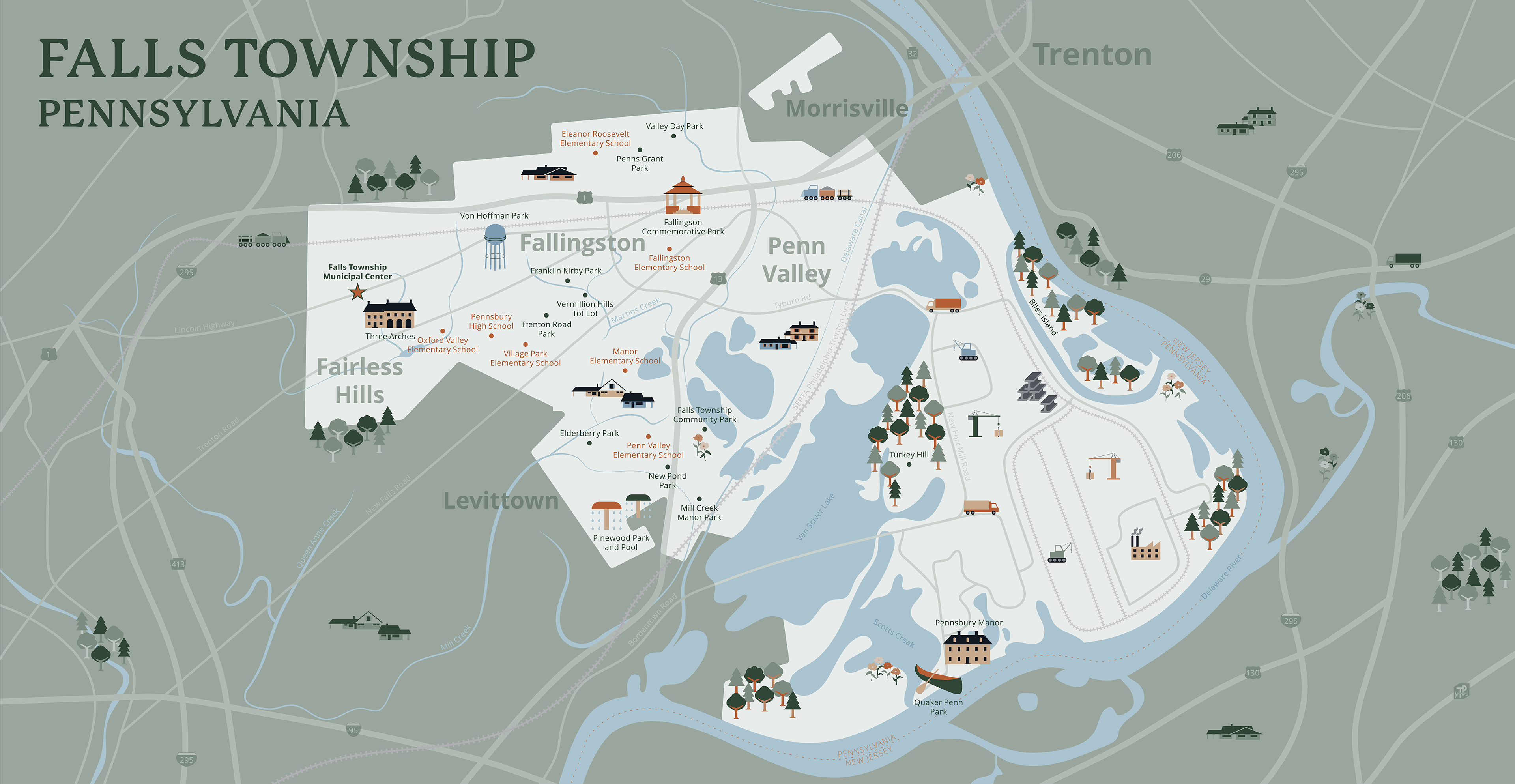 based on key landmarks throughout Falls Township.