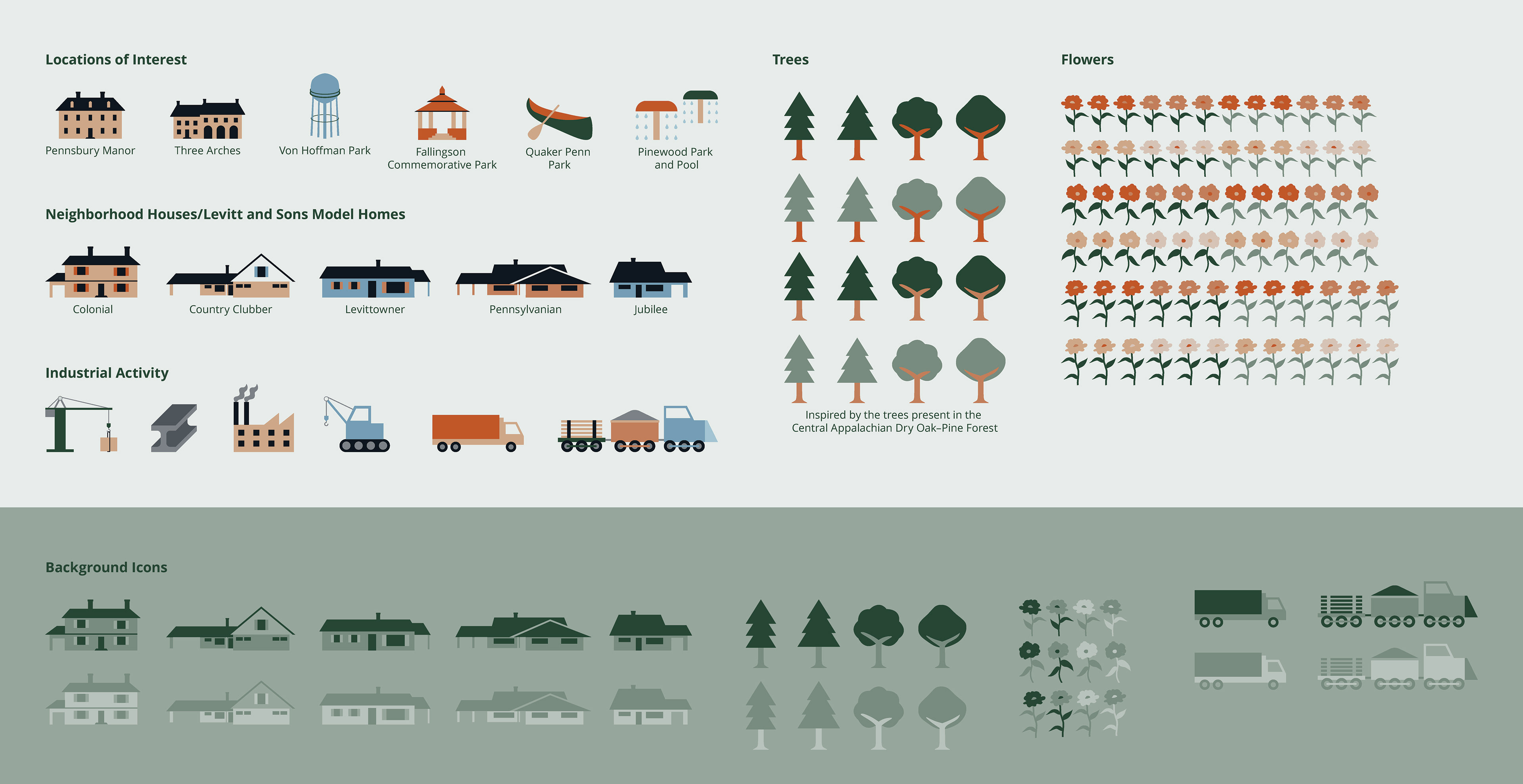 Research and inspiration images for the house icons, based on Levitt & Sons homes in Levittown, a planned community in Falls Township and one of the earliest examples of American suburban development.