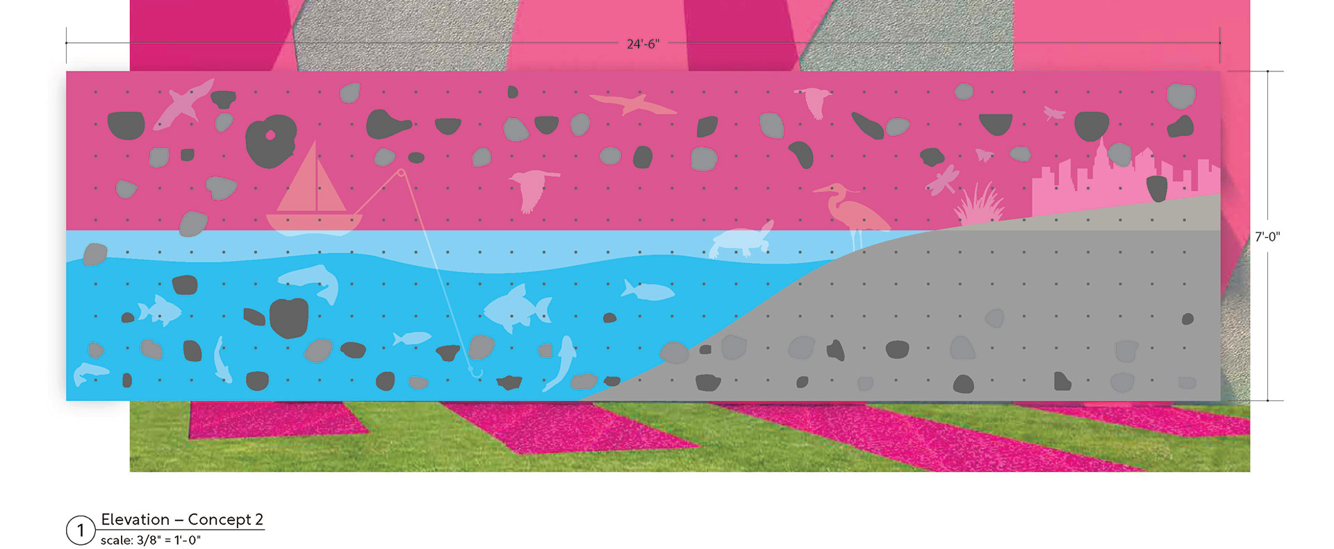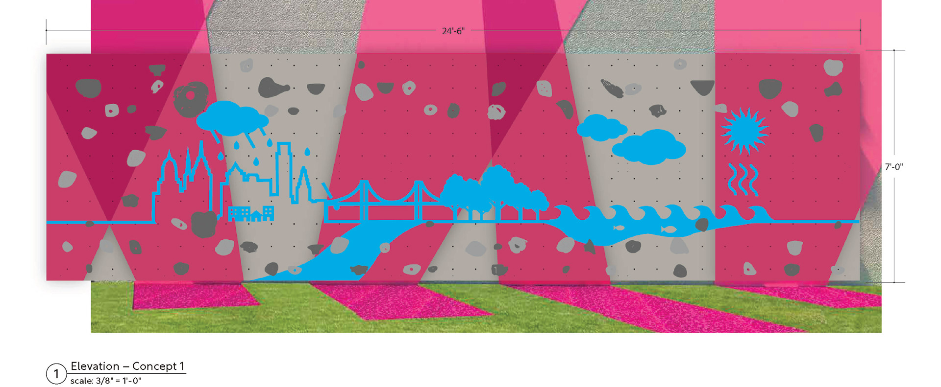 As the park continues to evolve, a traverse wall is planned as a future phase that extends the water cycle theme through movement and graphic storytelling. Drawing from the visual language of the interpretive panels, the wall will reinforce connections between the park, Philadelphia's watershed, and the surrounding community. I developed early design concepts for this element that were selected by the client; the project advanced beyond my tenure, and my contributions to the traverse wall remain conceptual.