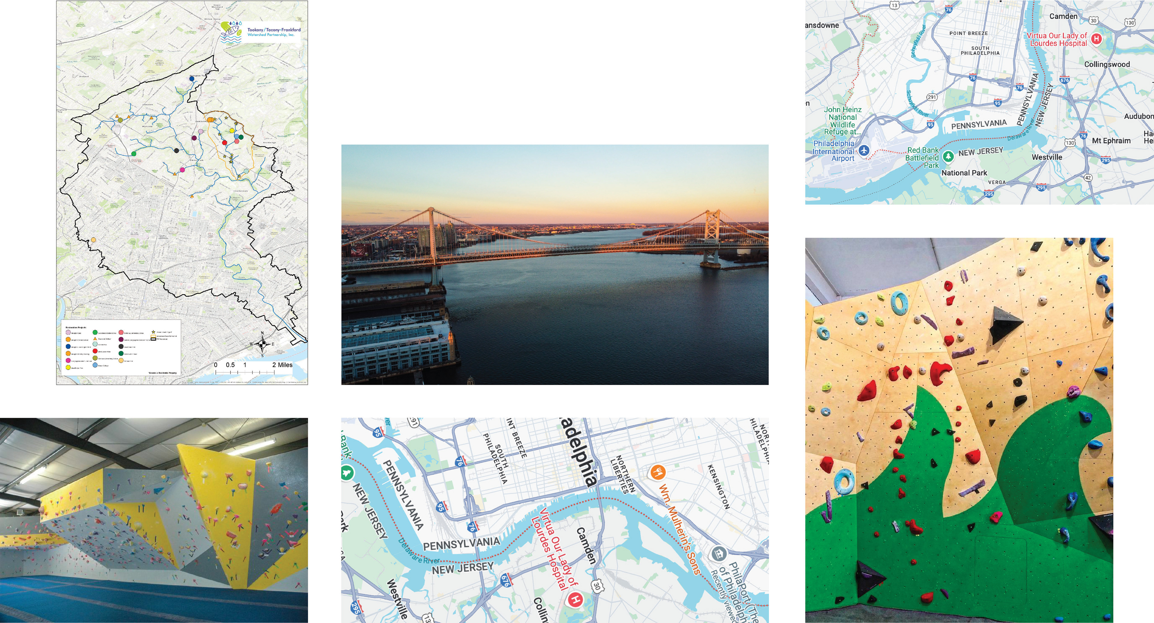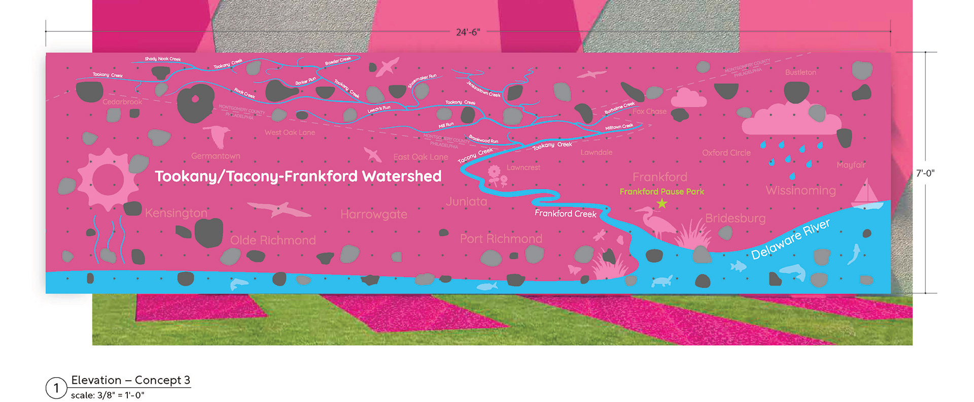 This traverse wall graphic concept, selected by the client, features a map of the Tookany/Tacony–Frankford Watershed. The design introduces children to their location within the watershed and illustrates how local waterways connect to the regional water system and water cycle.