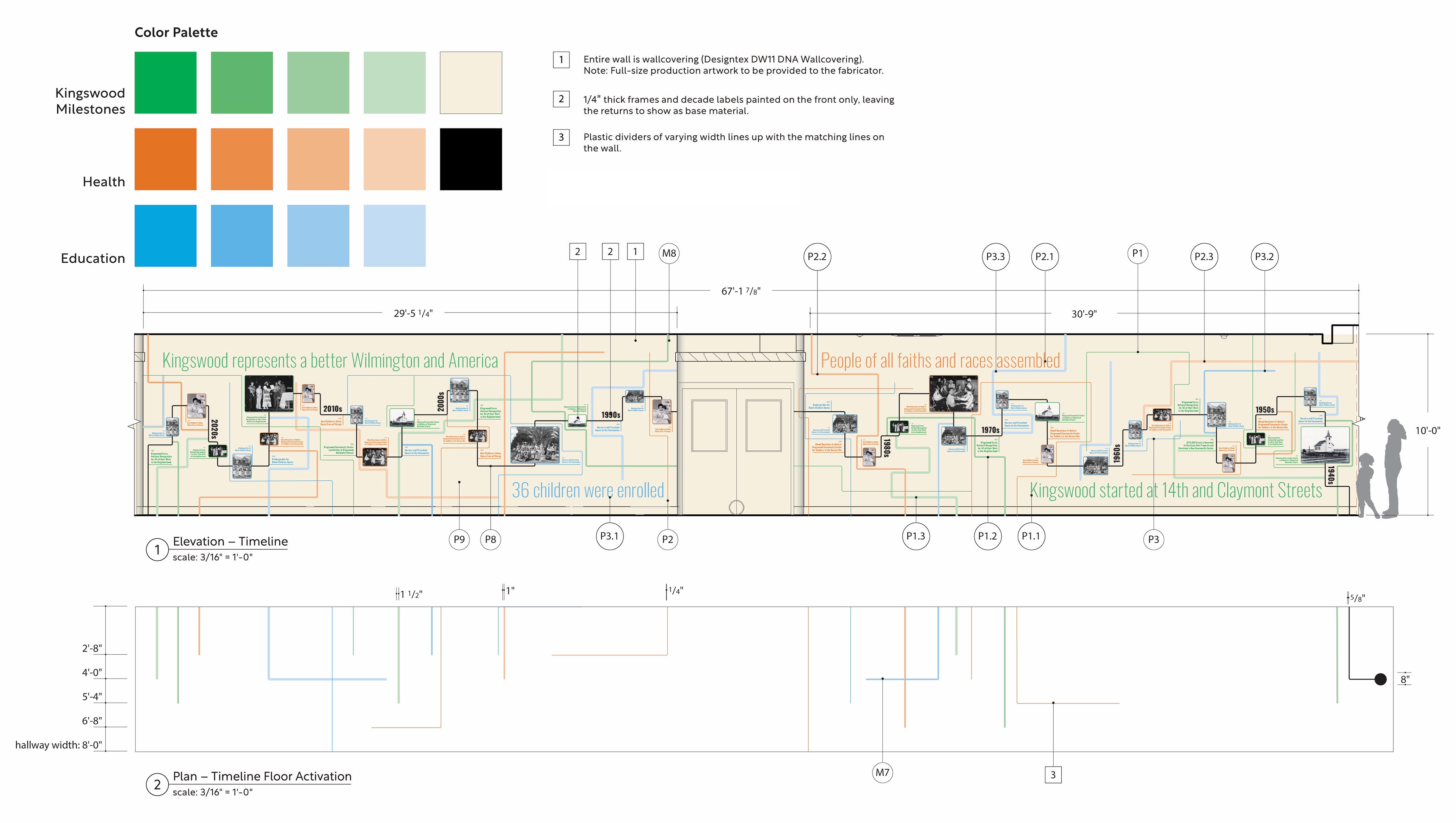 Detailed drawing of timeline wall. Content and imagery are placeholders designed to demonstrate the system’s layout and capacity for future historical data.