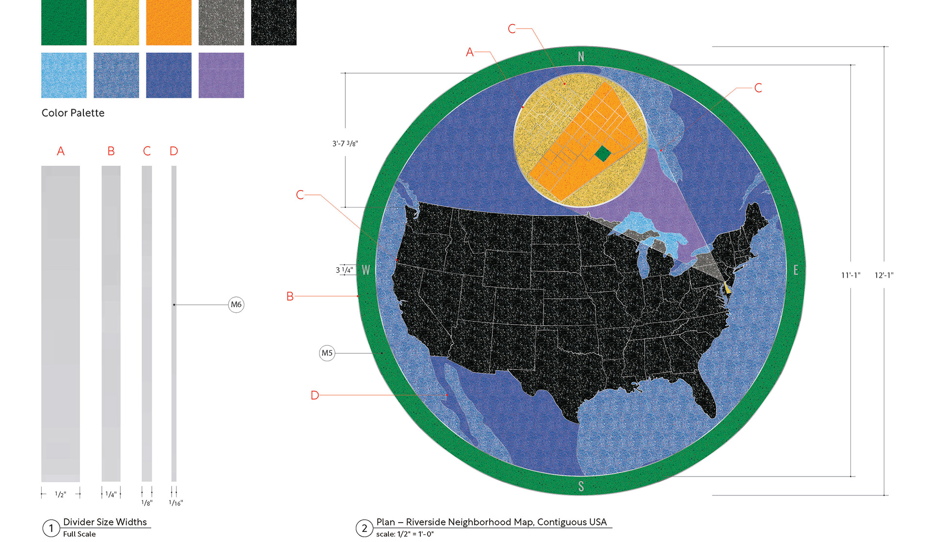 The timeline wall's color system informed the piping motif for these exterior panels.