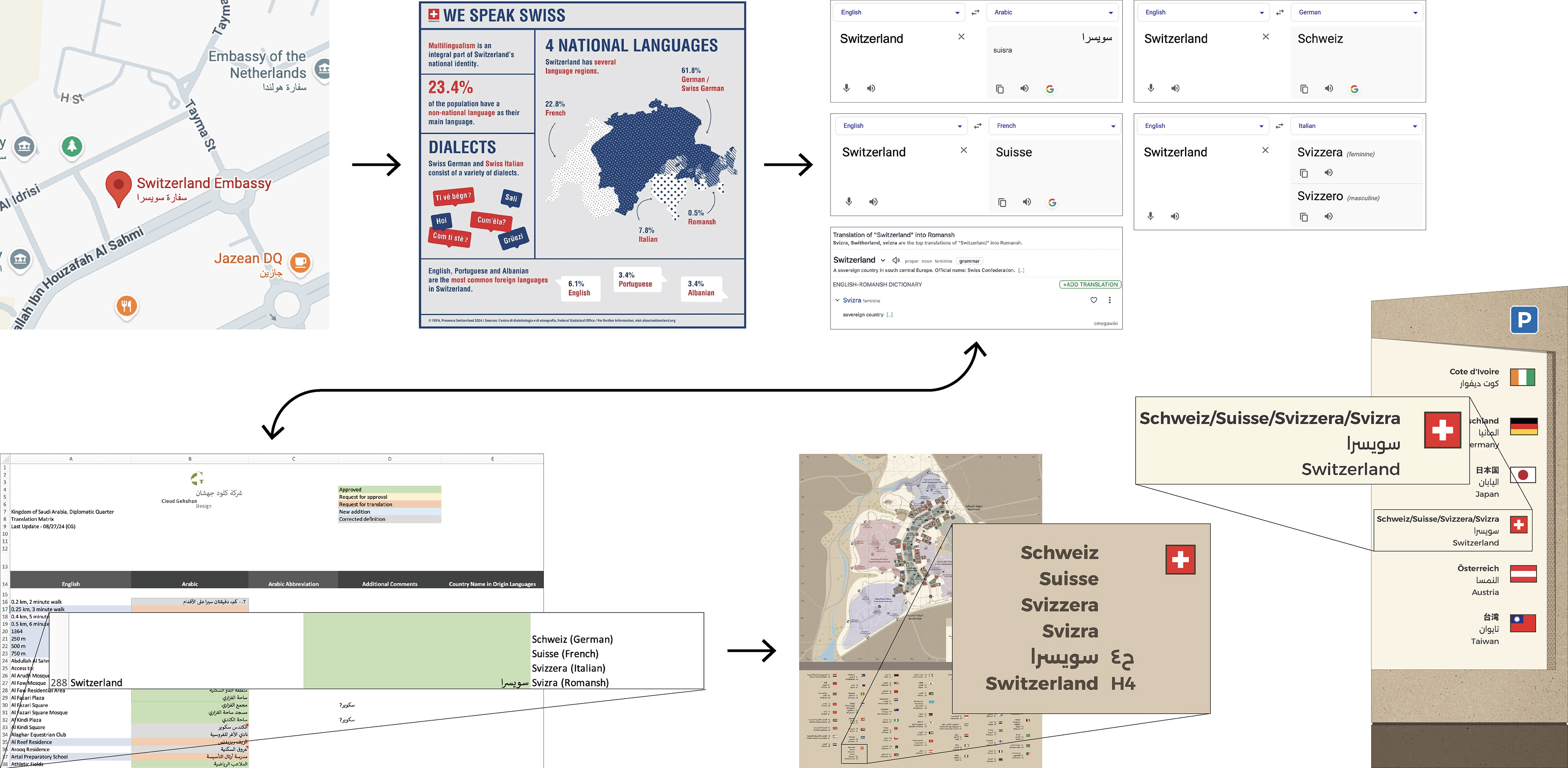 This workflow was repeated for over 60 embassy names and official languages, as well as bilingual labels across the wayfinding system.