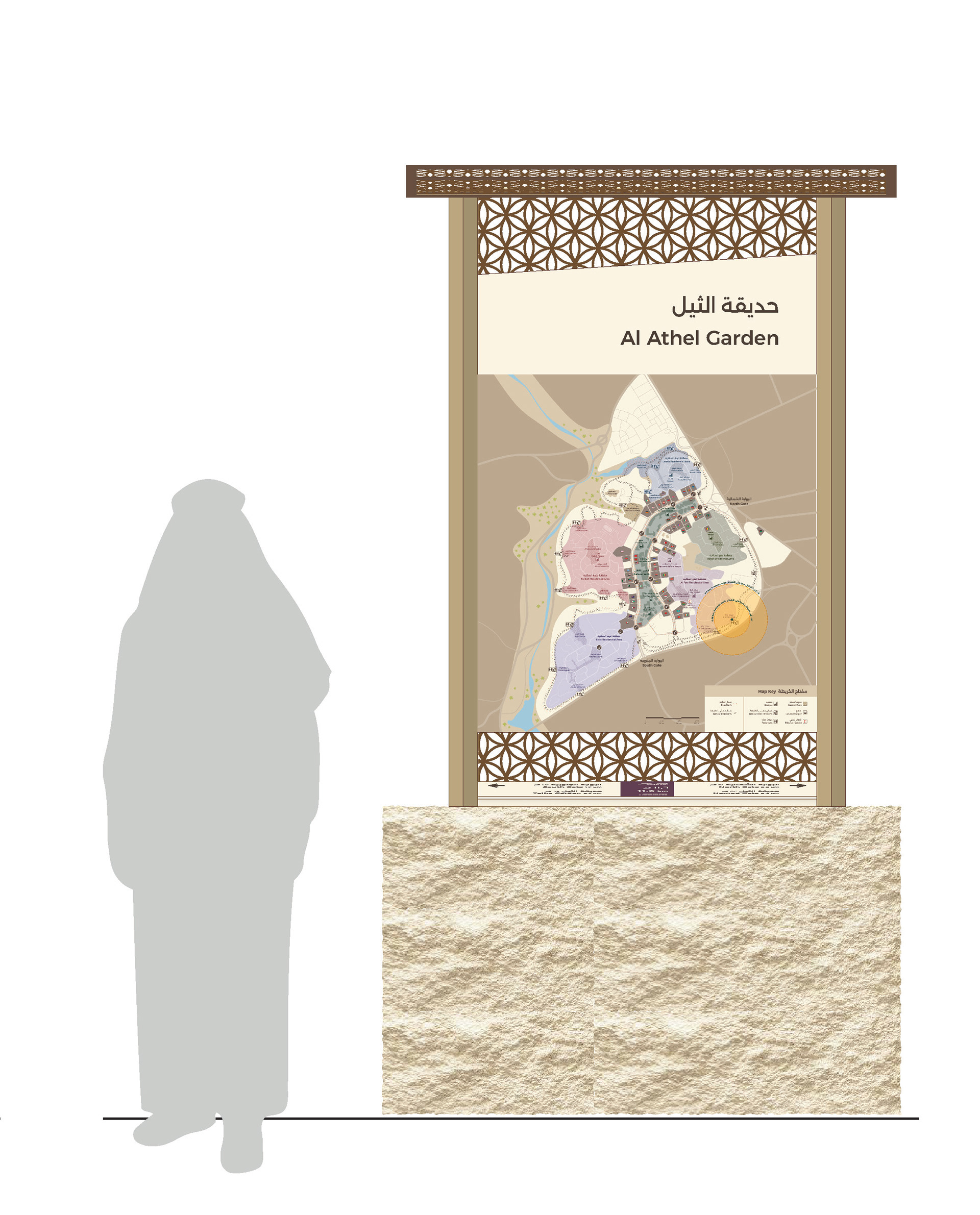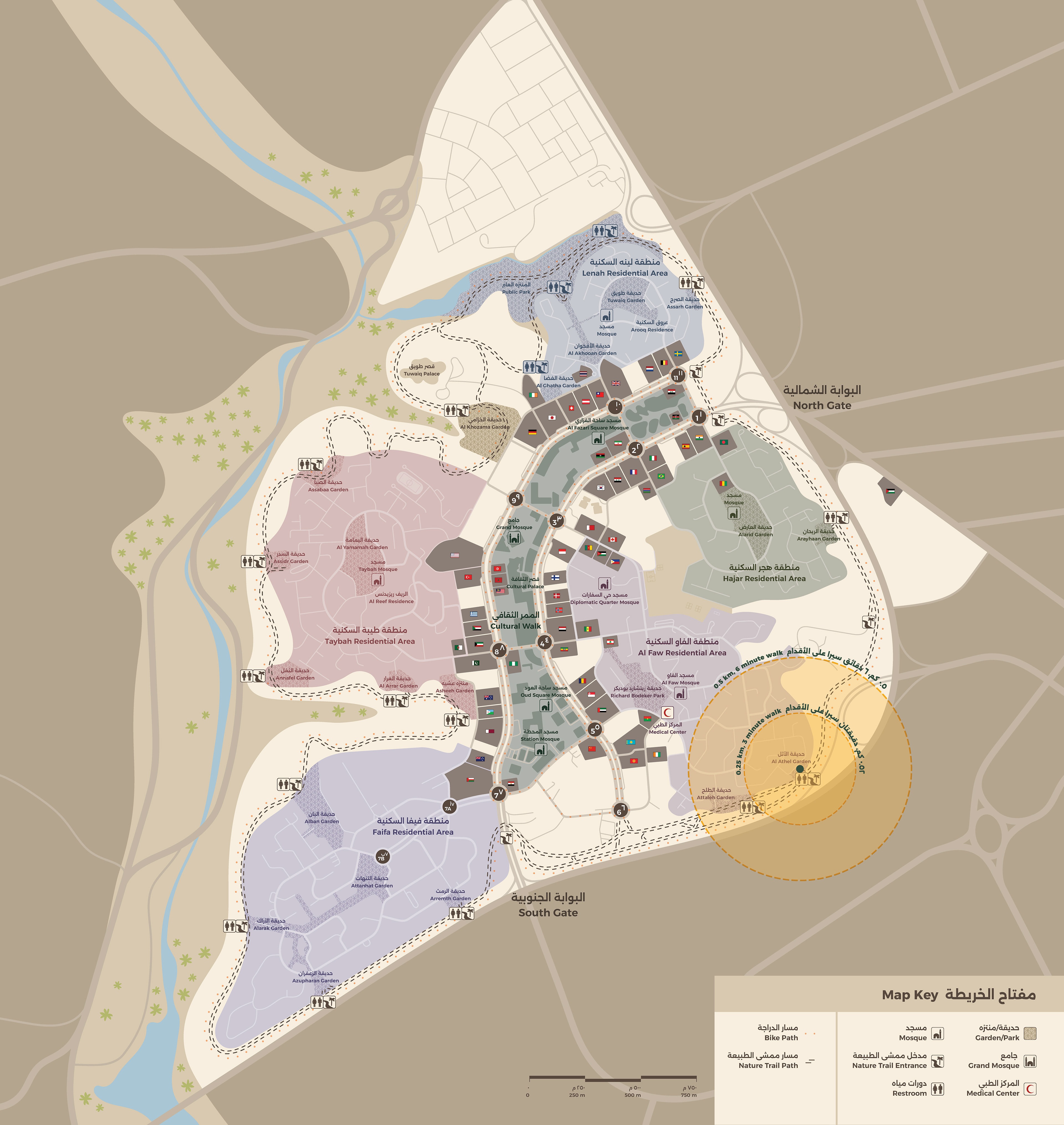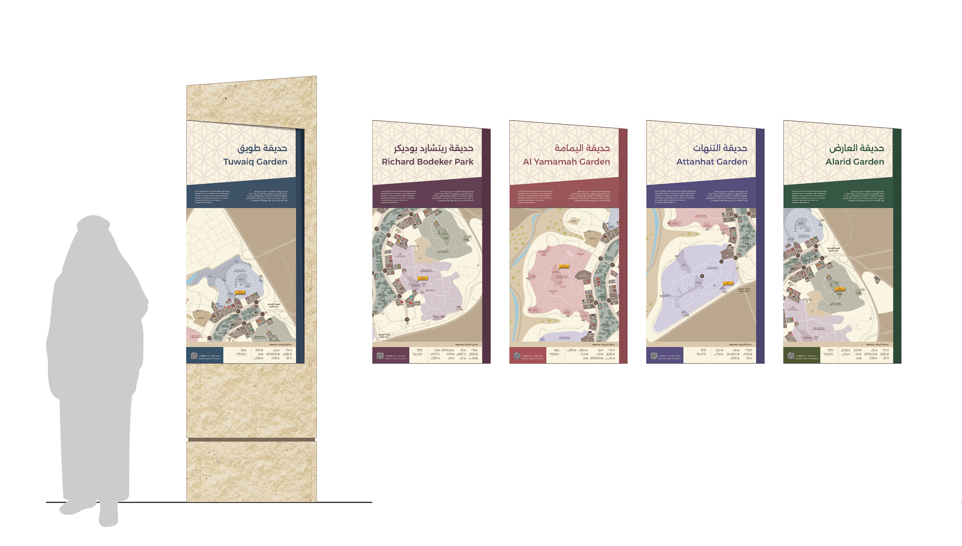 Cloud Gehshan Design created an extensive wayfinding signage system and master plan for the Diplomatic Quarter, a prominent embassy district and affluent residential neighborhood in Riyadh, Saudi Arabia. I was responsible for designing the wayfinding maps displayed on the signage throughout the district and managing the bilingual nomenclature for the entire wayfinding project.